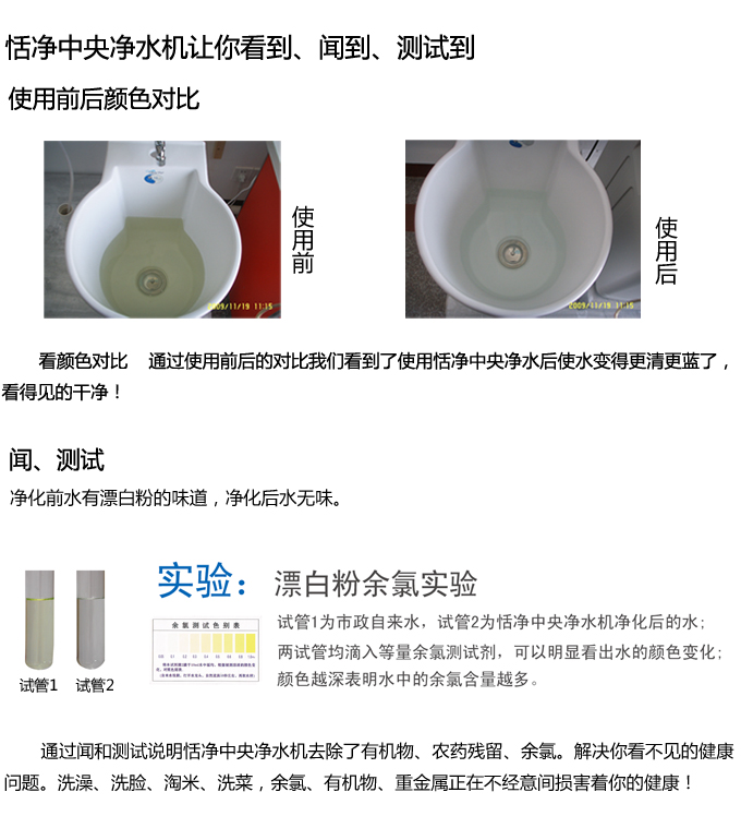 全屋凈水中央凈水機有效去除水中的異色、異味;進一步濾除水中微小雜質(zhì)、膠狀體;去除水中的漂白粉余氯、農(nóng)藥、重金屬;保留對人體有益的礦物質(zhì)。使水變得碧清、碧藍,去除對人體有害的物質(zhì)。